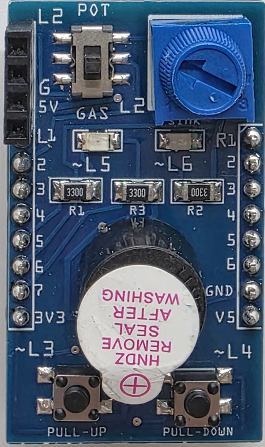 - 장착된 부품: 버튼 두 개, LED 두 개, 부저, 포텐시오미터, 가스 센서 장착 핀, 선택 스위치