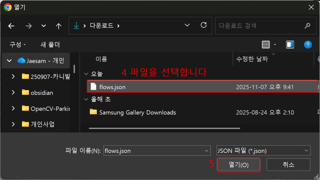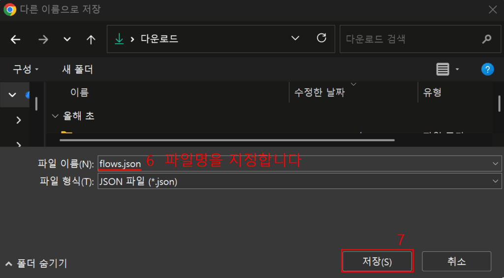 현재 플로우 > JSON > 다운로드를 선택합니다.