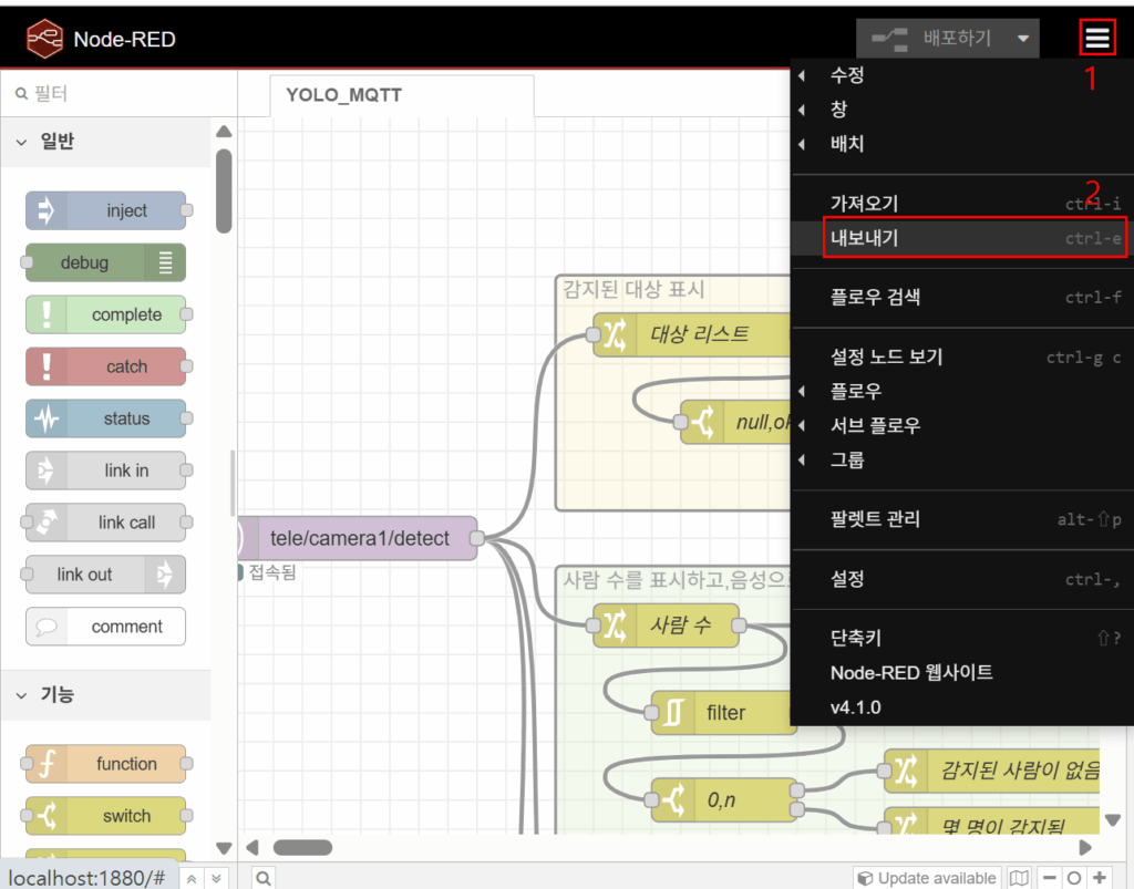 Node-RED의 플로우는 JSON형식의 텍스트로 표현됩니다. 따라서 클립 보드를 사용하여 복사하여 붙여 넣을 수도 있고, 파일 형식으로 저장하여 불러 올 수도 있습니다.