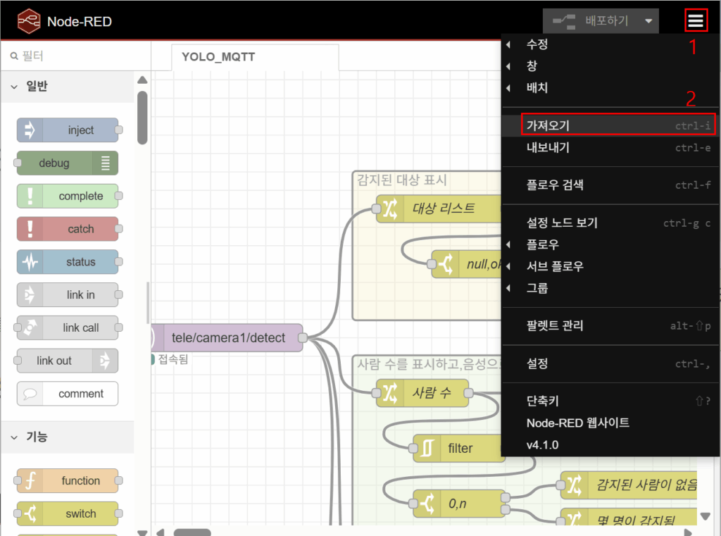 파일로 보관되어 있는 플로우를 Node-RED의 플로우 탭으로 불러 올 수 있습니다.