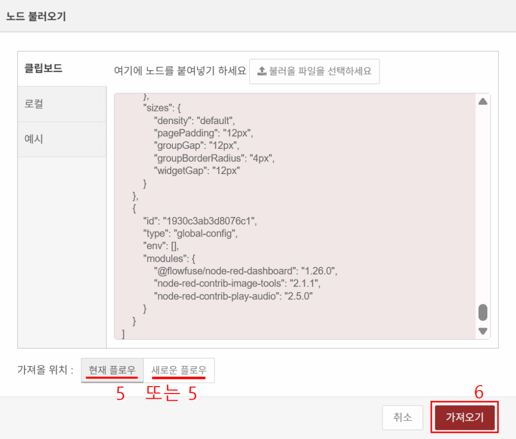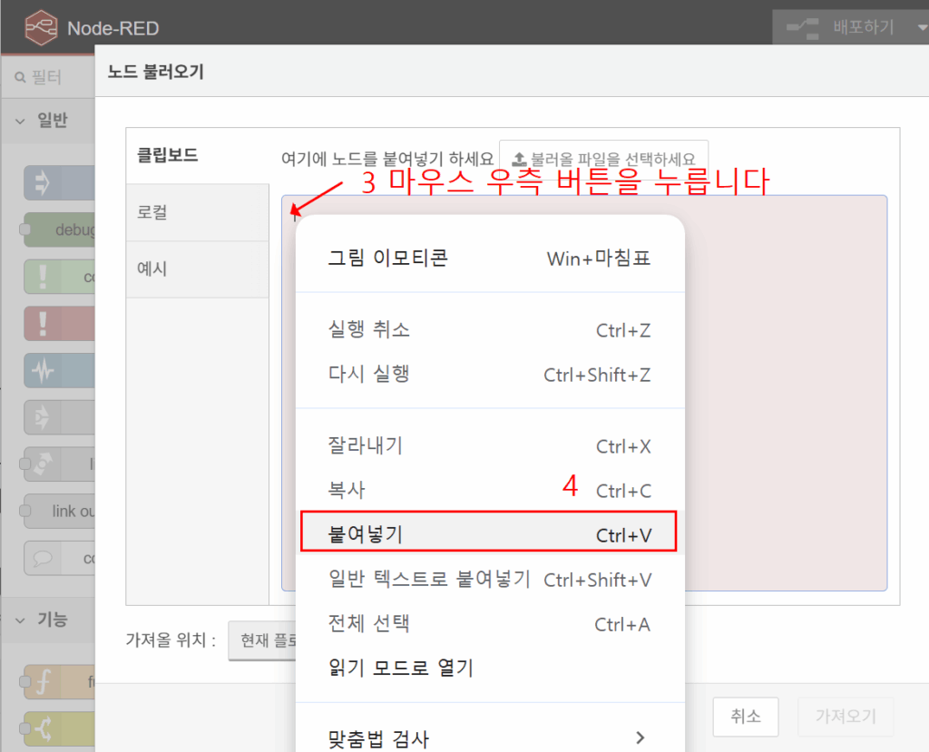 Node-RED에서 클립보드로 내보내기한 플로우의 내용을 가져올 수도 있고, 외부에서 복사한 플로우를 가져 올 수도 있습니다.